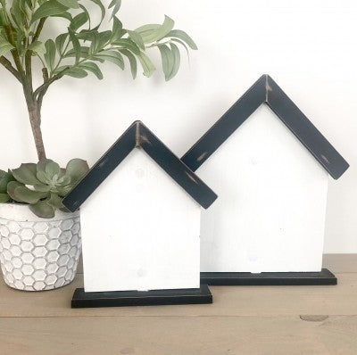 Unfinished kit measures apx. 10"x8" on the larger house, and includes wooden MDF: * 2 house backs with pegs * 2 house roofs * 2 bases with peg holes