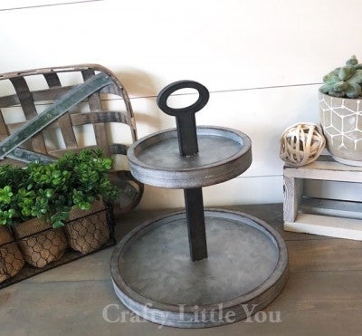 Unfinished tray measures 11” wide on the base 7.25” on the top tier 12” tall and 6.5” in between the two trays TRAY is made out of wooden MDF Comes all unassembled and will have tabs to fit inside holes for assembling. You will need to glue them into place.
