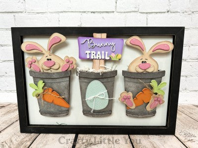 Unfinished kit measures apx. 6" tall on the sign and includes wooden MDF: *2 bunnies *4 ear overlays *2 mouths *2 noses *4 feet *12 toe pads *4 foot pads *1 Sign *1 set of “Bunny Trail” wood letters *1 set of miniature Easter eggs and grass *2 carrots *1 egg *Vinyl *3 Velcro dots