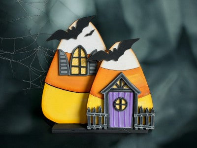 Unfinished kit measures apx. 7" tall and includes wooden MDF: *2 candy corn main pieces *3 bat overlays *1 door *1 door window overlay *1 door awning with attaching fence *1 window with attached shutters