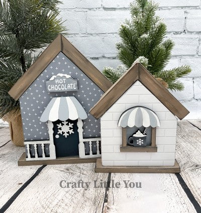 House Base sold separately Unfinished kit measures apx. 8"x6.25" and includes wooden MDF: *2 house overlays *1 hot cocoa sign and white vinyl *1 window with mug and white vinyl *2 railings *1 snowflake *1 porch cover *2 pieces of velcro