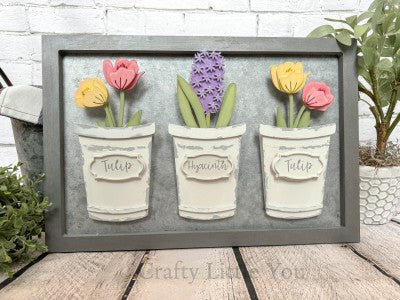 Unfinished kit measures apx. 6.25" tall on the hyacinth and includes wooden MDF: *4 tulips with attached stems *4 center tulip petal overlays *4 top tulip petal overlays *1 hyacinth with attached stem *1 hyacinth leaf overlay *Hyacinth bud overlays *3 signs *3 sign frames *Vinyl stencil *3 Velcro dots