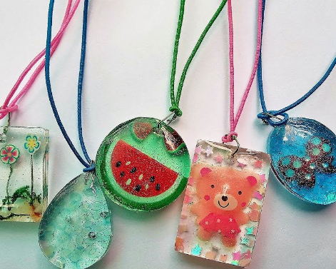 Resin is cool and kid friendly! We make necklaces, earrings, keychains, magnets and more!