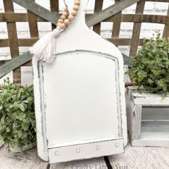 Unfinished kit measures apx. 15"x8" and includes wooden MDF: * 1 grooved charcuterie board with holes drilled for shelf * 1 peg board piece for shelf * 1 front piece for shelf with holes * 1 square stand holder * 1 triangle stand (Stand holder and triangle stand are glued to the backside.)