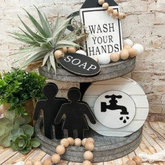 Tier Tray sold separately Unfinished kit measures apx. 6" tall on the circle, and includes: * 1 "Wash Your Hands" Sign * 1 set of Man & Woman Bathroom Figurines * 1 Grooved Circle with Faucet Overlay * Black Vinyl