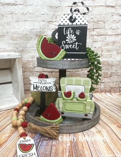 Unfinished kit measures 5.75” tall on the Truck and includes wooden MDF” •truck and tailgate with watermelons attached •2 watermelons with grooves •1 street sign, base and vinyl •vinyl seeds •tag with white vinyl life is sweet