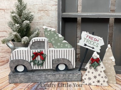 Tuck Base sold separately Unfinished kit measures apx. 6" tall Kit includes 3 wooden trees, sign, vinyl, and dowel *truck sold separately